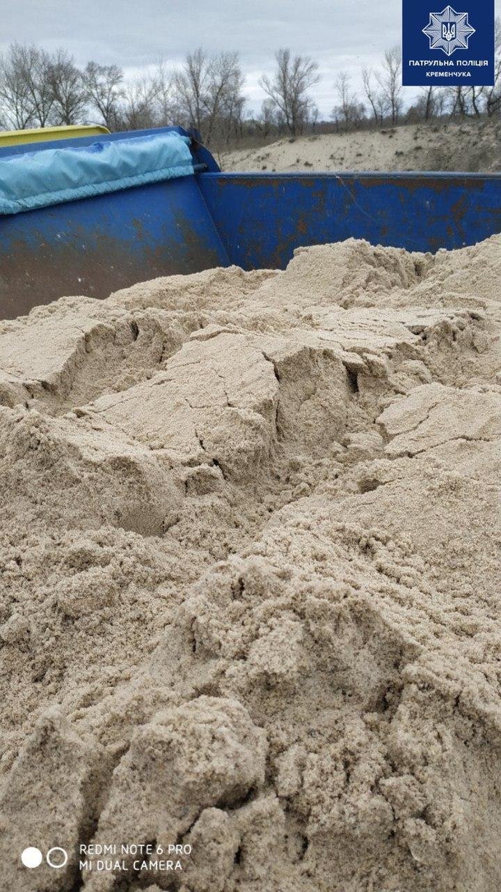 Сьогодні вранці, 31 березня, патрульні поліцейські виявили осіб, що проводили маніпуляції з піском. Під час патрулювання набережної Лейтенанта Дніпрова, неподалік Крюківської дамби, патрульні побачили вантажний автомобіль DAF, кузов якого був заповнений піскосумішшю. Також виявили трактор Komatsu, який рив пісок.