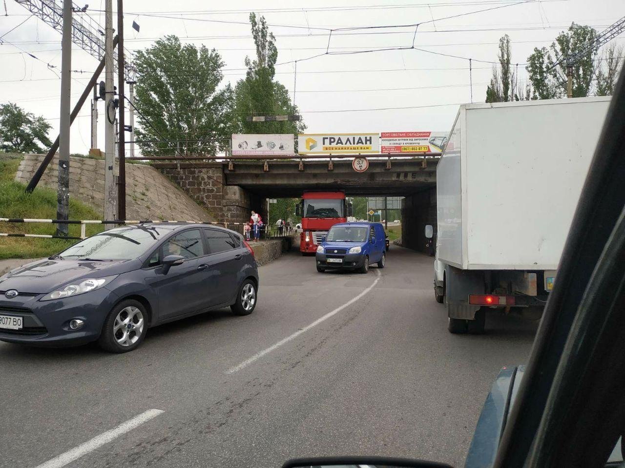 Сьогодні, 5 травня, під шляхопроводом на Першому Занасипу застрягла вантажівка. Фотографію з місця надала автоспільнота Drive 2 Кременчук.