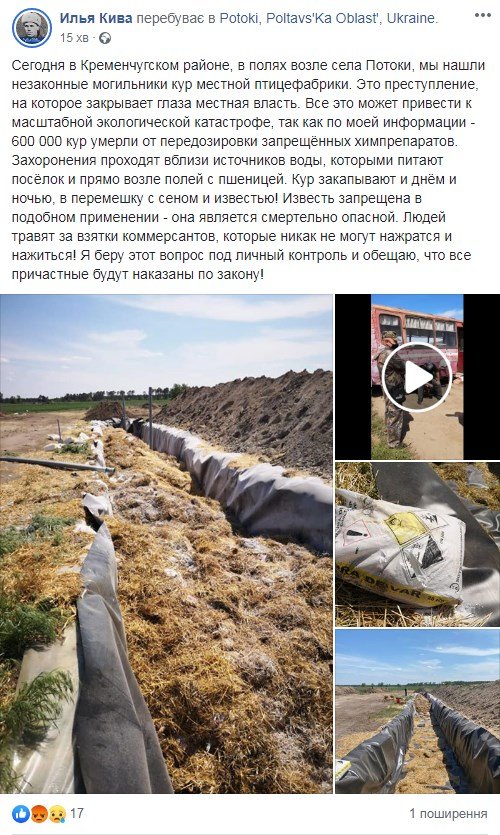11 травня нардеп Ілля Кива на своїй сторінці у фейсбуці заявив, що кури на птахофабриці під Кременчуком померли від передозування заборонених хімпрепаратів.