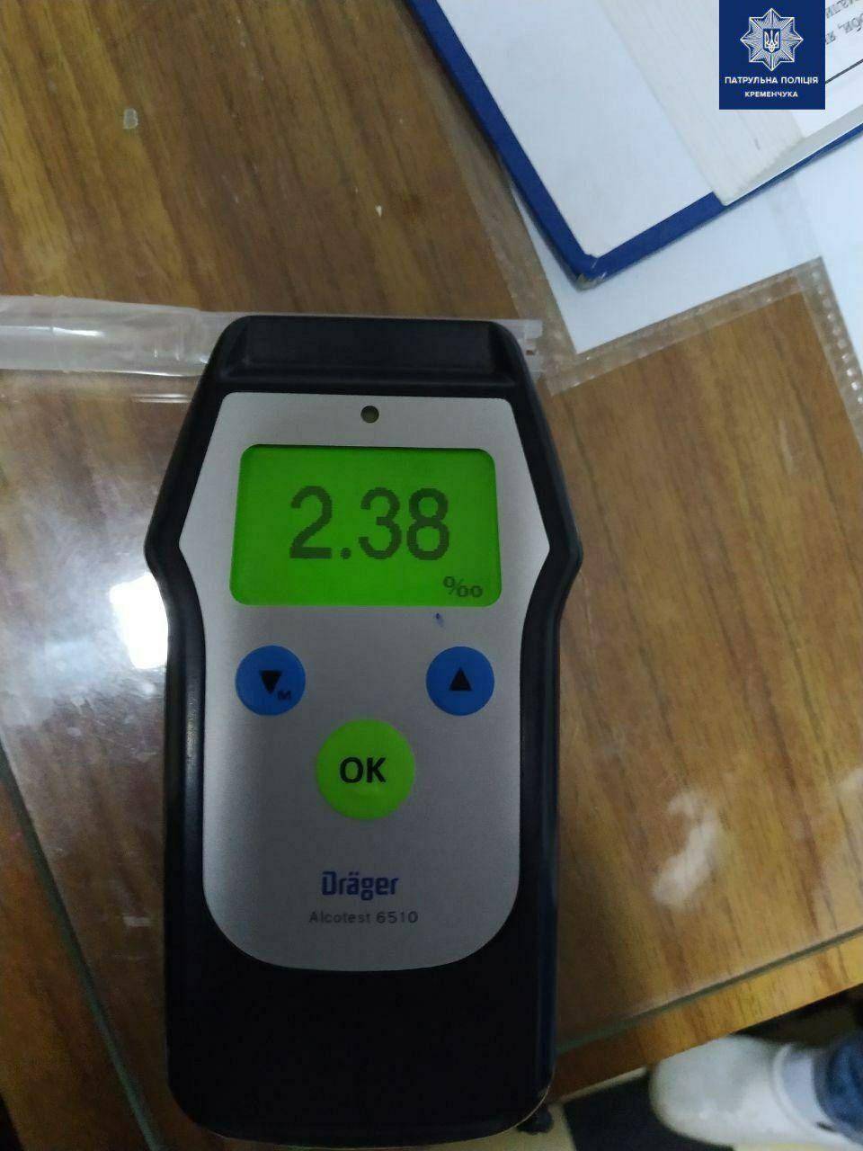 Кременчужанин выглядел пьяным и дутьё в «Драгер» это подтвердило – его результат составил 2,38 промилле при норме 0,2 промилле.