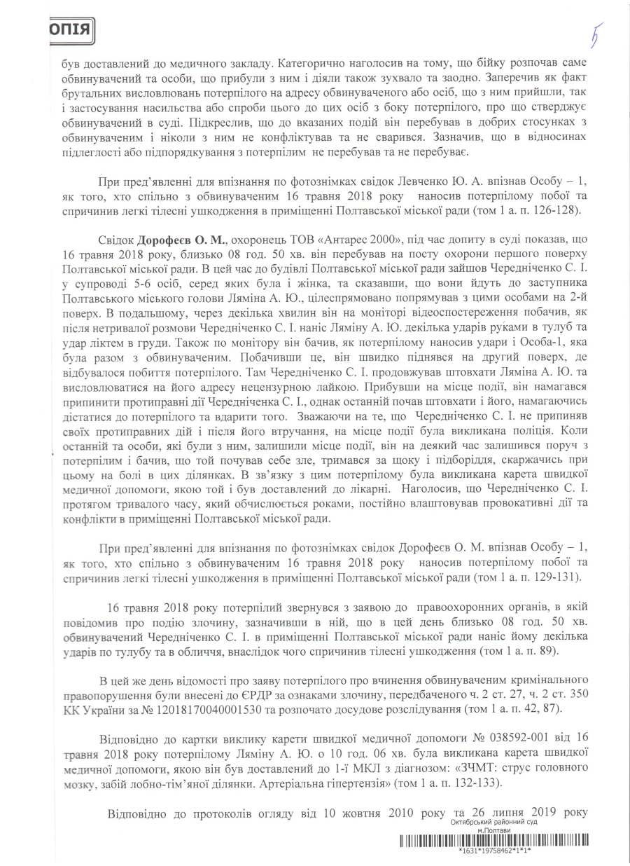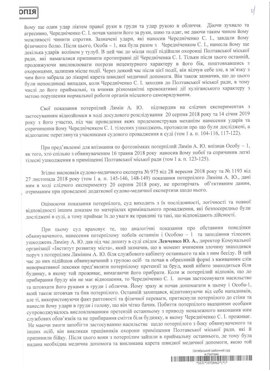 Сергій Чередніченко протягом 2015-2016 років був депутатом Полтавської міськради. 16 травня 2018 року Чередніченко разом з іншою особою перебували у приміщенні Полтавської міськради. У коридорі другого поверху вони побачили тодішнього заступника міського голови Андрія Ляміна, зав'язався конфлікт. Відповідно до тексту вироку, Чередніченко наніс Ляміну близько 4 ударів по тулубу кулаками і один удар ліктем у груди. Інша особа схопила потерпілого та штовхнула його. У результаті Лямін вдарився потилицею об стіну. Потім особа один раз ударила правою ногою в тулуб та один раз кулаком в голову.
