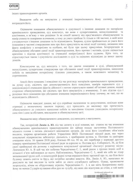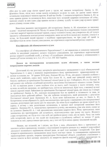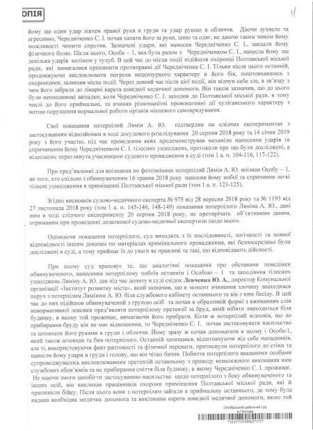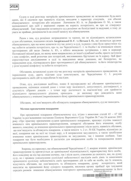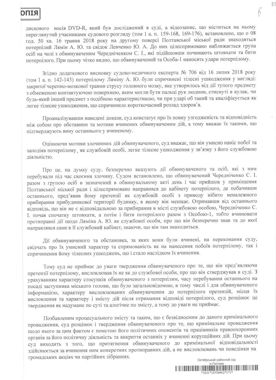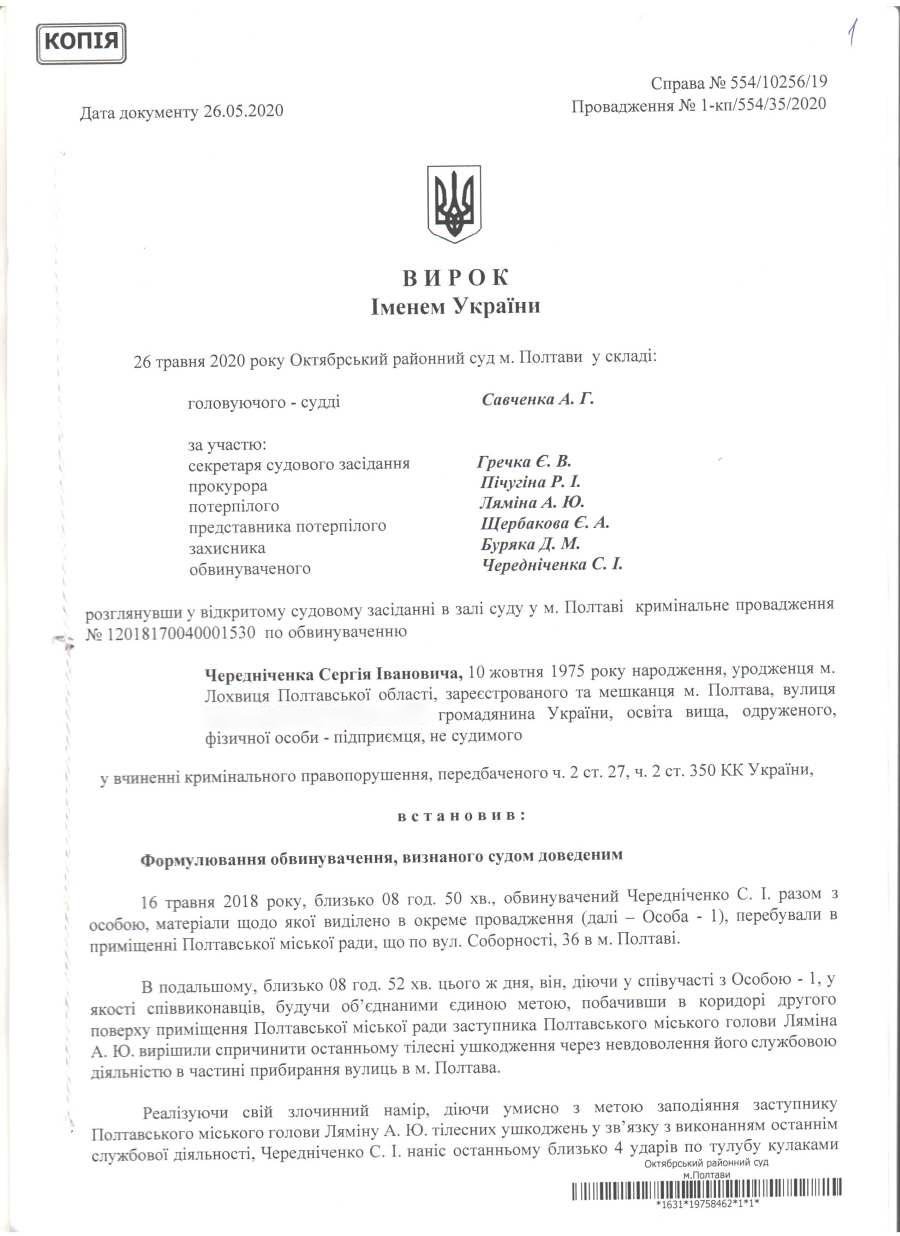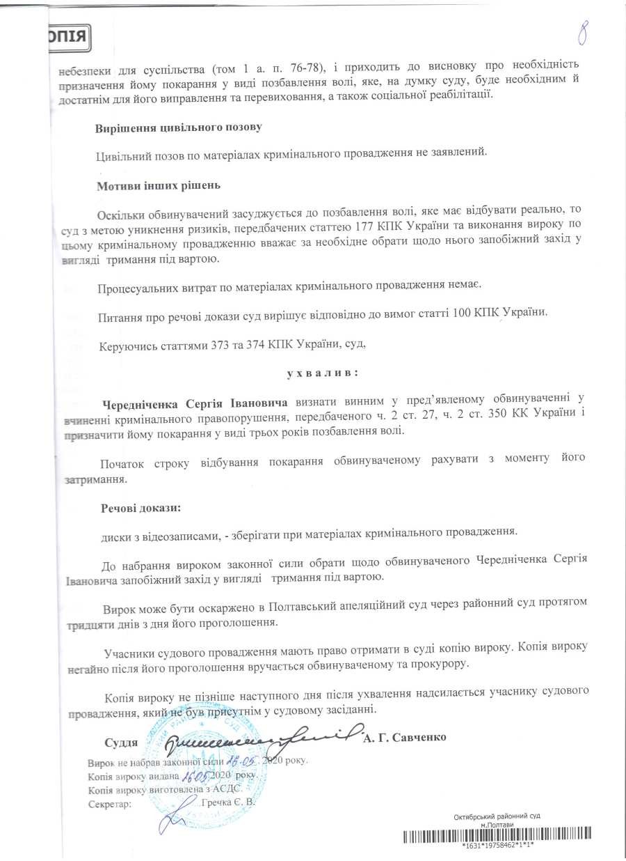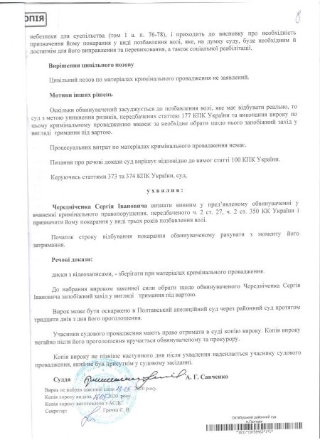26 травня Октябрський районний суд Полтави виніс вирок Сергію Чередніченку за порушення ч. 2. ст. 27, ч. 2 ст. 350 Кримінального кодексу України (Погроза або насильство щодо службової особи чи громадянина, який виконує громадський обов'язок). Копію тексту оприлюднило інтернет-видання «Полтавщина».