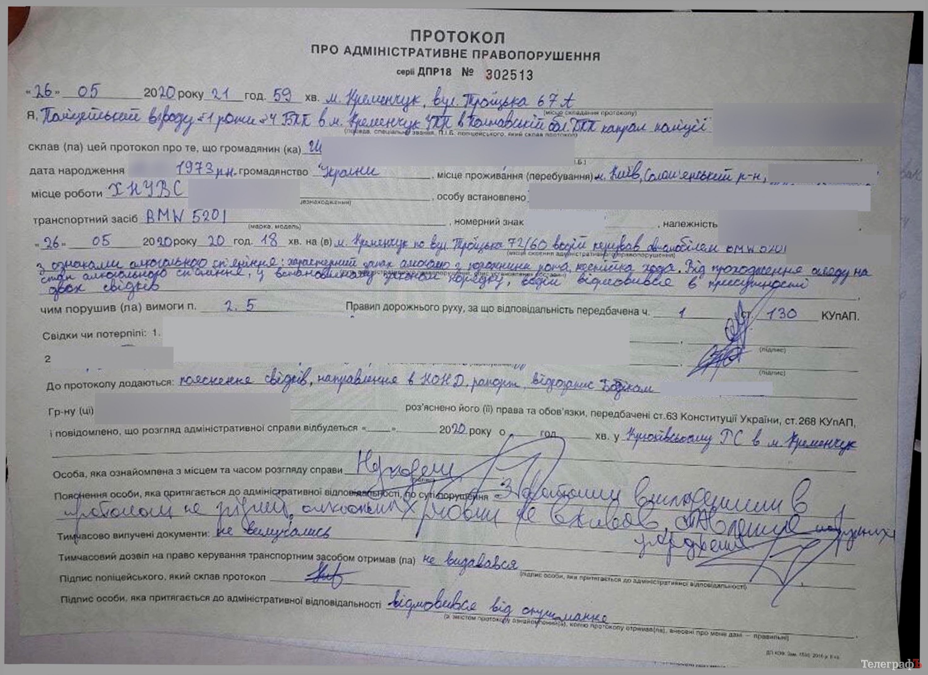 У розпорядженні «Телеграфа» опинилися два адмінматеріали, складені на особу з керівництва Харківського національного університету внутрішніх справ. Мова йде про протокол за порушення ст. 130 та постанову за порушення ч. 1 ст. 122 КУпАП.