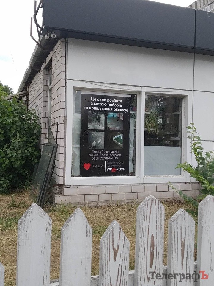 Власник мережі квіткових магазинів Олександр Тараненко детально розповів «Т», про що «говорить» цей плакат. Олександр пояснив, що протягом півтора року понад 10 разів у магазинах розбивали вітрини. Підходили неодноразово різні люди, які пропонували «співпрацю». Буцімто якщо Олександр буде працювати з ними, ніхто скло бити не буде.