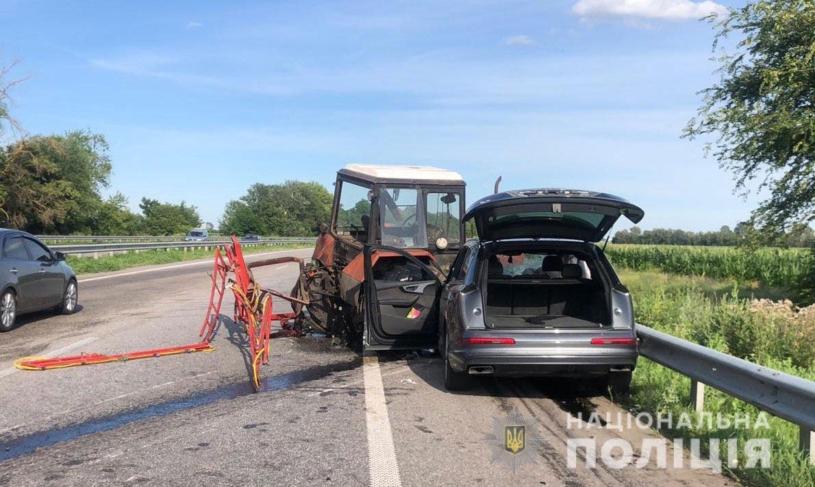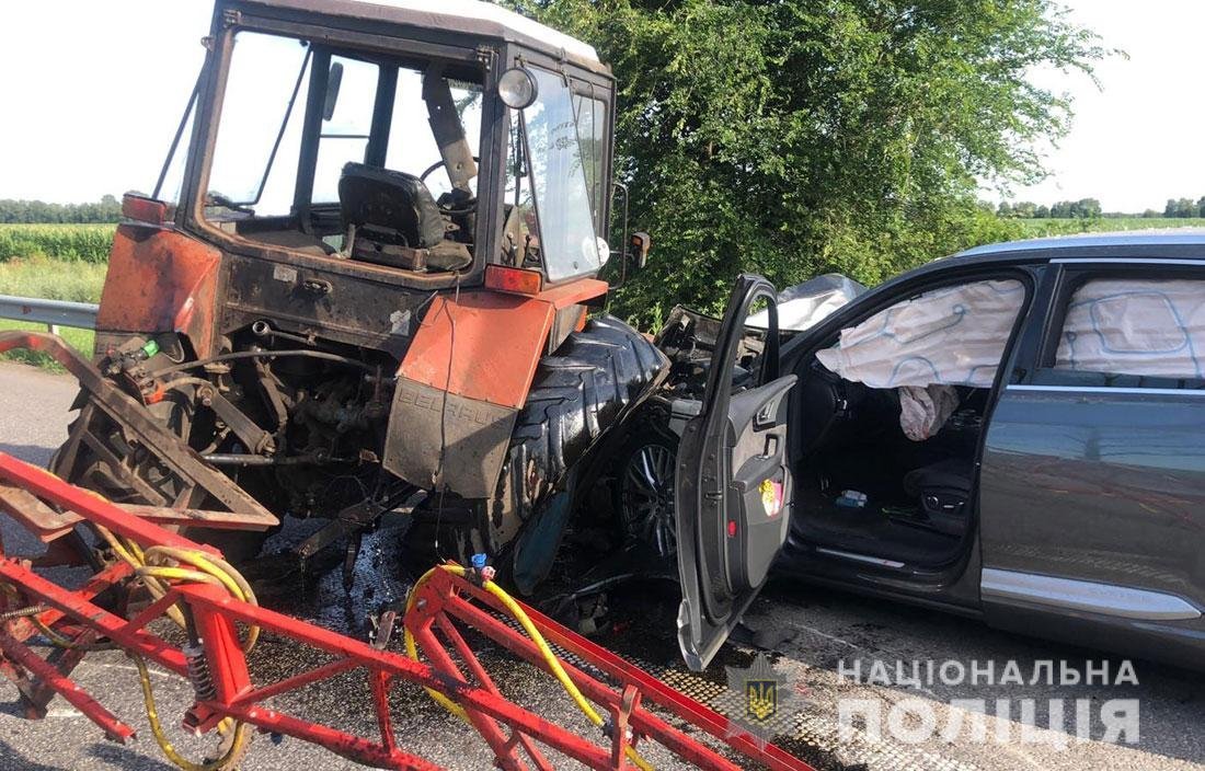 В результате ДТП 38-летний водитель автомобиля получил телесные повреждения в виде политравмы, 58-летний водитель трактора – закрытую черепно-мозговую травму и многочисленные ушибы. Открыто уголовное производство по части 1 статьи 286 (Нарушение правил безопасности дорожного движения) Уголовного кодекса Украины. Полиция проводит проверку.