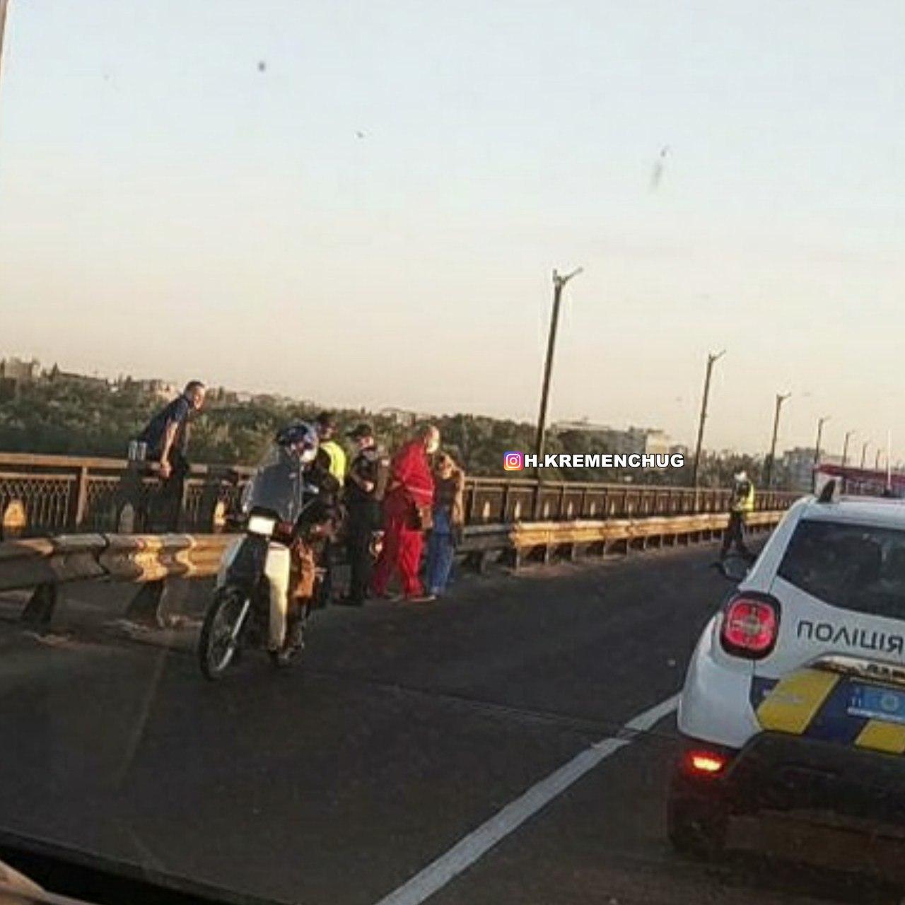 Сьогодні вранці, 4 серпня, на Крюківському мосту трапився інцидент. На поручнях мосту сидів чоловік.
