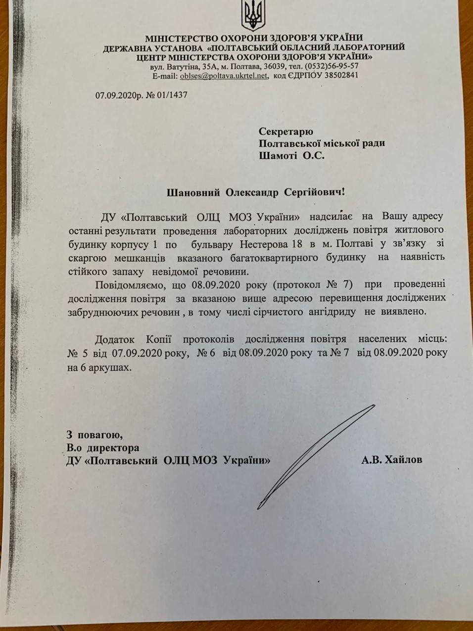 За інформацією ГУ ДСНС у Полтавській області, провели лабораторне дослідження забруднюючих речовин в повітрі та виявили перевищення вмісту сірчистого ангідриду. Особовий склад ДСНС за рішенням комісії провів санітарну обробку приміщень житлового будинку.