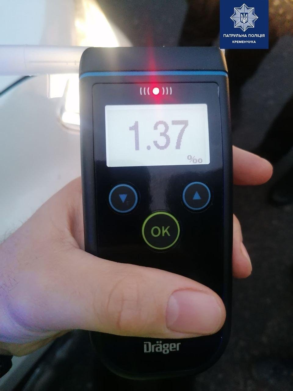 На вулиці Шевченка зупинили автомобіль Renault Megane за порушення правил дорожнього руху під час проїзду перехрестя. За кермом перебував 59-річний чоловік з ознаками алкогольного сп'яніння. Алкотестер показав 1,37 проміле, що майже у 7 разів перевищує допустиму норму.
