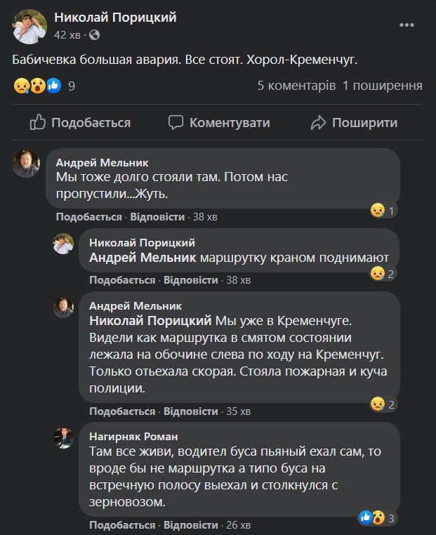Микола Порицький пише у фейсбуці, що через велику аварію ускладнено рух дорогою. В напрямку Кременчука на узбіччі лежить зім'ята маршрутка. На місці була «швидка», поліція та рятувальники.
