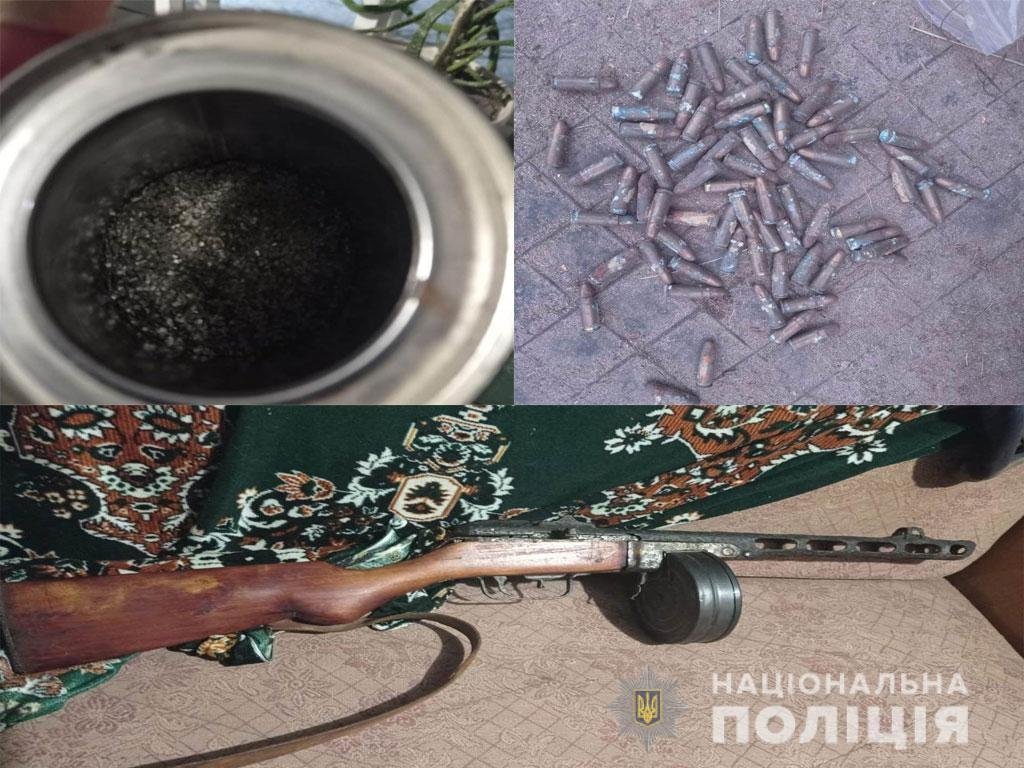 Під час обшуку удома у 61-річного чоловіка вилучили пістолет-кулемет «Шпагіна», вогнепальну рушницю «Simson», більше 70-ти набоїв калібру 7,62 та чотири ємності з порохом.