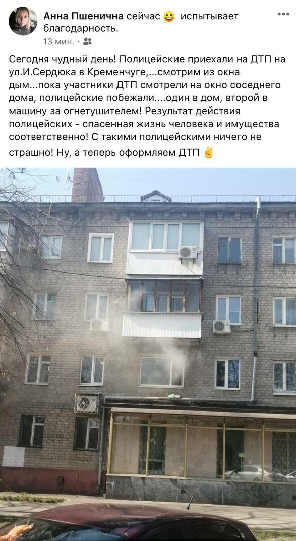 10 квітня патрульні приїхали оформити ДТП на вул. Ігоря Сердюка, а врятували будинок від пожежі. Історію на своїй сторінці у Фейсбук описала очевидиця Анна Пшенична.