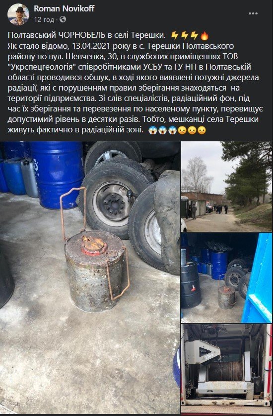 13 квітня Роман Новіков опублікував у Facebook інформацію про те, що цього ж дня у с. Терешки Полтавського району на вул. Шевченка в службових приміщеннях ТОВ «Укрспецгеологія» співробітниками СБУ та ГУ НП в Полтавській області проводився обшук, в ході якого виявили потужні джерела радіації, які зберігалися з порушенням правил.