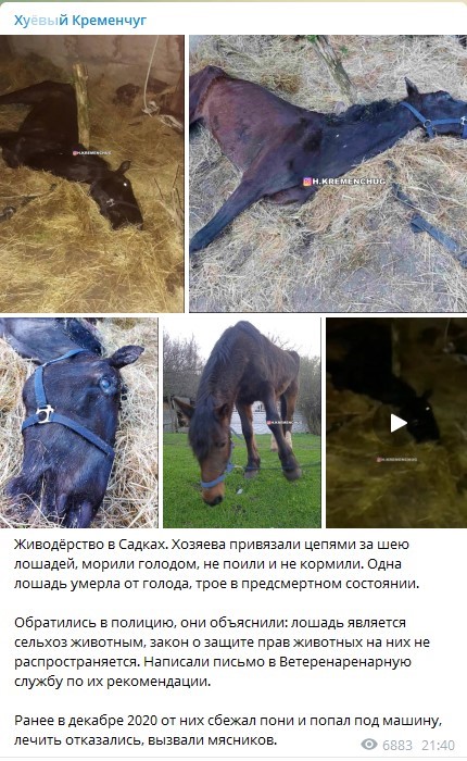 22 квітня у спільноті h.kremenchug з'явилось повідомлення про те, що у Садках господарі знущаються над кіньми: прив'язали їх ланцюгами, не годують, не напувають і не лікують. Одна кобила померла, а ще троє - у поганому стані. У грудні від них втік поні і потрапив під машину. Тоді його, нібито, замість лікування здали на м'ясо.