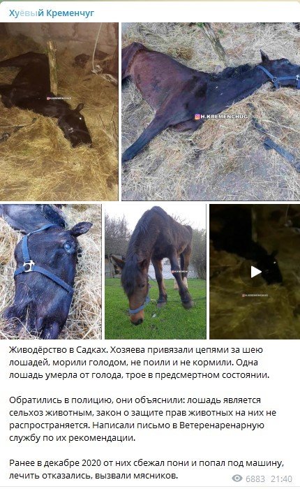 22 квітня у спільноті h.kremenchug з’явилось повідомлення про те, що у Садках господарі знущаються над кіньми: прив’язали їх ланцюгами, не годують, не напувають і не лікують. Одна кобила померла, а ще троє – у поганому стані. У грудні від них втік поні і потрапив під машину. Тоді його, нібито, замість лікування здали на м’ясо.