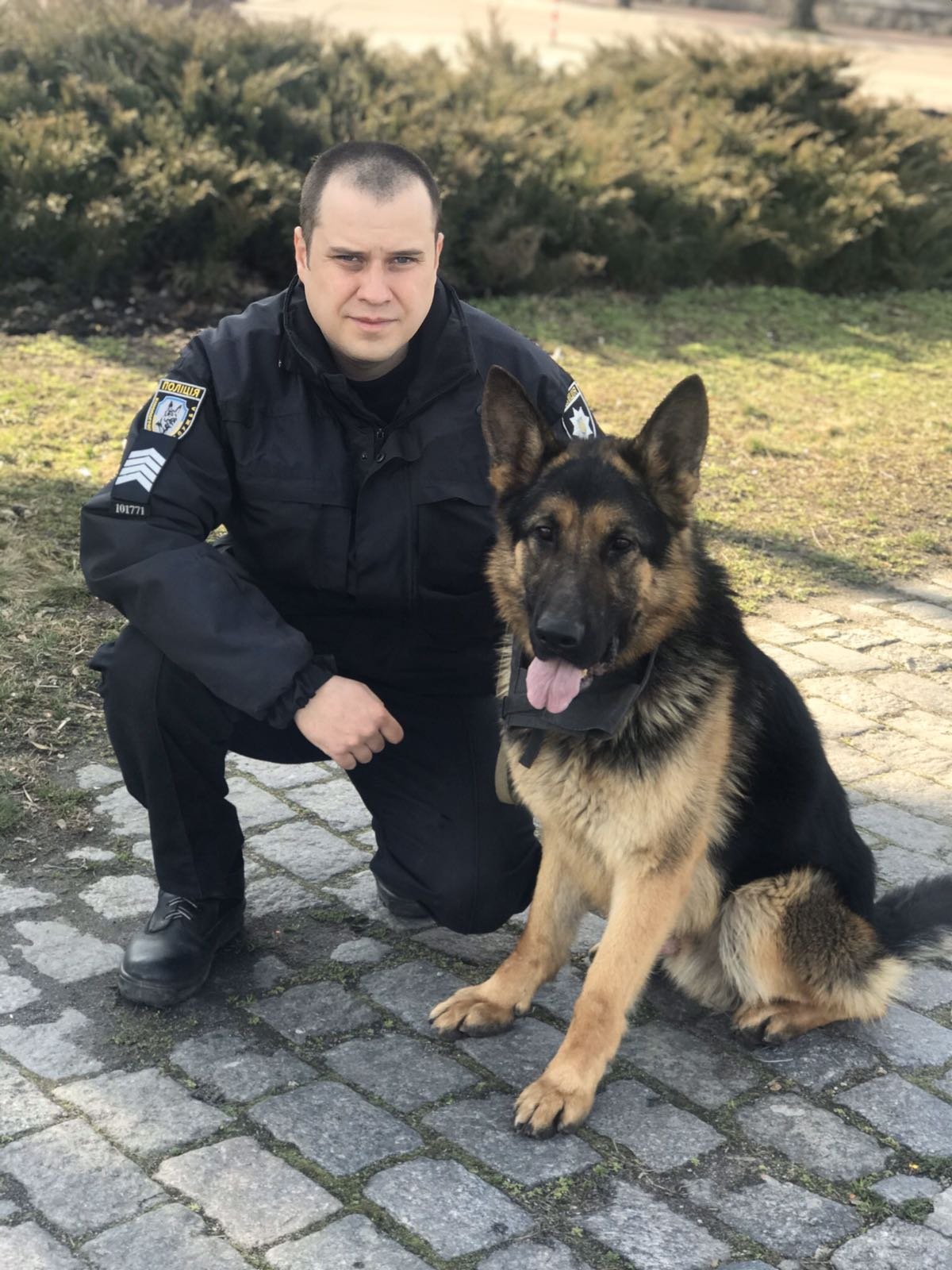 Карат (німецька вівчарка) – шукає вибухівку. Ми писали про нього, коли він був ще щеням. Карат змінив лабрадора Діну, яка поїхала працювати до Полтави.