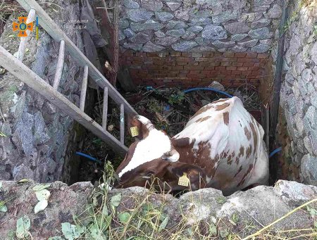 Рятувальники, які прибули на виклик, за допомогою пожежних рукавів та із залученням екскаватора одного із місцевих жителів витягли корову на поверхню.