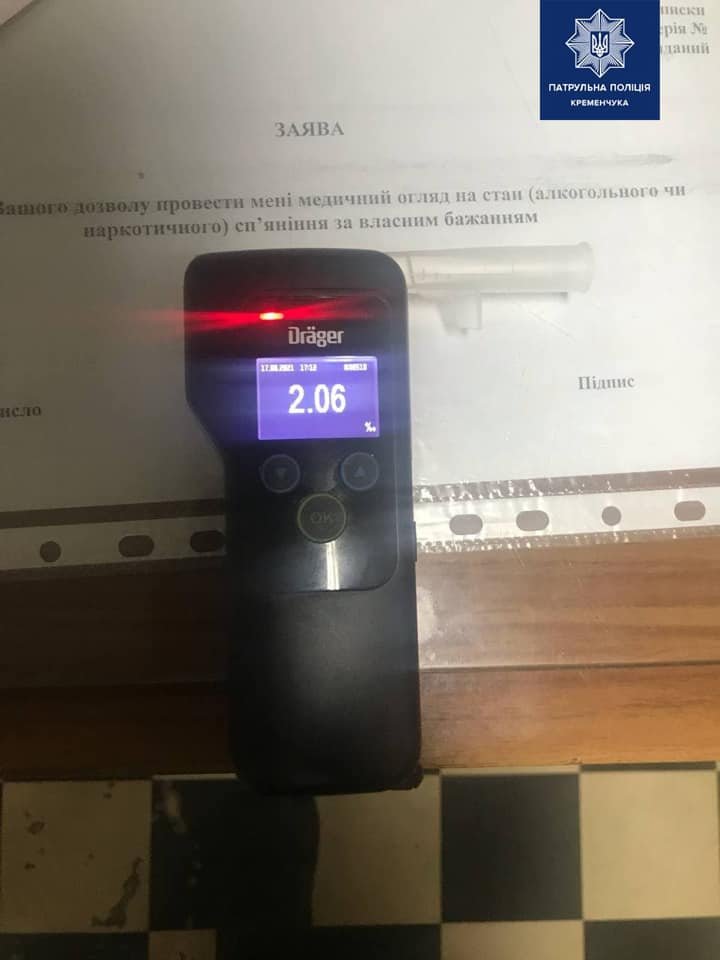 На кременчужанина склали адміністративні матеріали: за ч. 4 ст. 130 (Вживання водієм транспортного засобу алкоголю до проведення огляду з метою встановлення стану алкогольного сп'яніння), за ст. 124 (Порушення ПДР, що призвело до ДТП), за ст. 122–4 (Залишення місця ДТП), за ч. 1 ст. 126 (Керування транспортним засобом без страхового поліса) та за ч. 2 ст. 126 (Керування транспортним засобом особою, яка не має права керування) КУпАП.