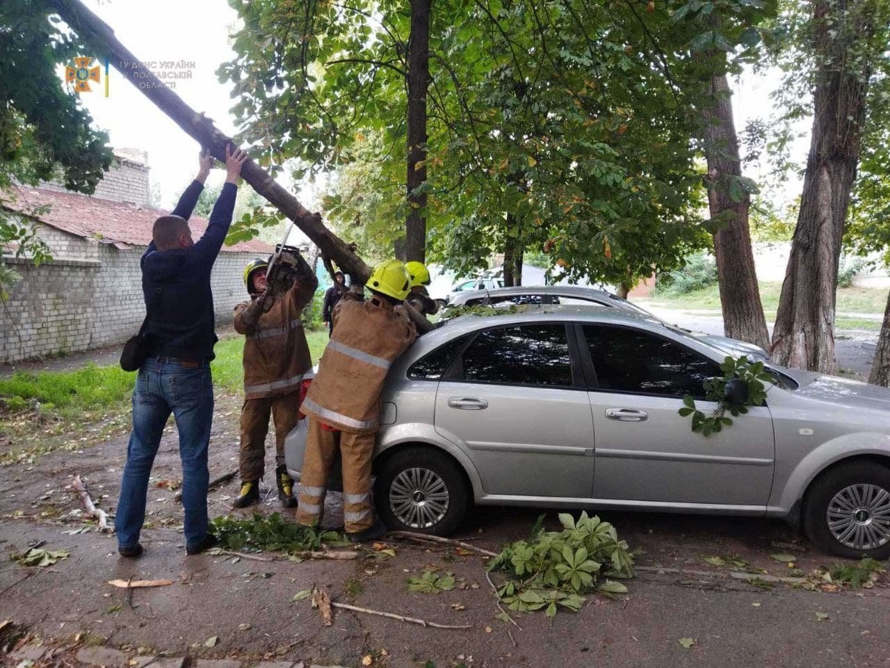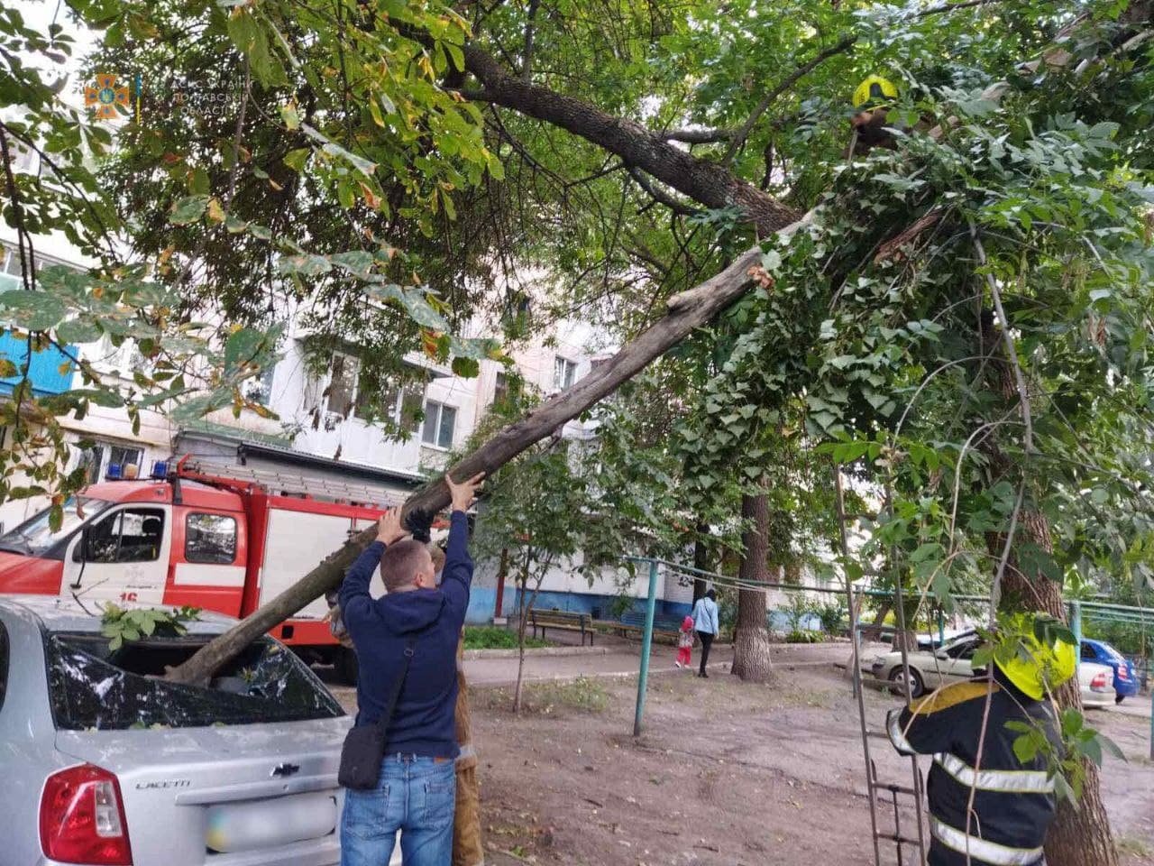 Від місцевих мешканців надійшло повідомлення про те, що за вище вказаною адресою внаслідок пориву вітру, надломилася гілка з дерева, впала та застряла в задньому склі легкового автомобіля Chevrolet Lacetti. За допомогою бензопили «Штіль» та рятувальної мотузки, працівники ДСНС розпилили та витягли гілку з автомобіля. На місці події потерпілих не було.