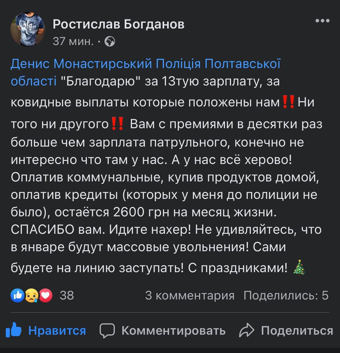 – «Дякую» за 13-ту зарплату, за ковідні виплати, які нам обіцяні. Ні того, ні іншого! Сплативши комунальні, купивши продуктів додому, сплативши кредити (яких у мене до поліції не було), залишається 2600 грн на місяць життя. Спасибі вам. Ідіть на***! Не дивуйтесь, що у січні будуть масові звільнення, – пише Ростислав.