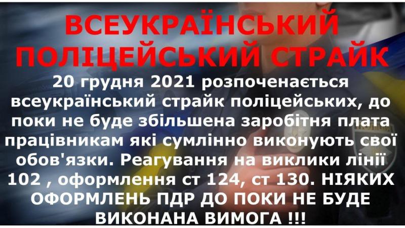 З 20 грудня поліцейські негласно страйкують за підвищення зарплати. Це проявляється у тому, що вони стовідсотково виїздять на виклики, але ведуть себе максимально толерантно – де це можливо, обмежуються попередженнями, а не постановами. Про це вони пишуть у соцмережах.