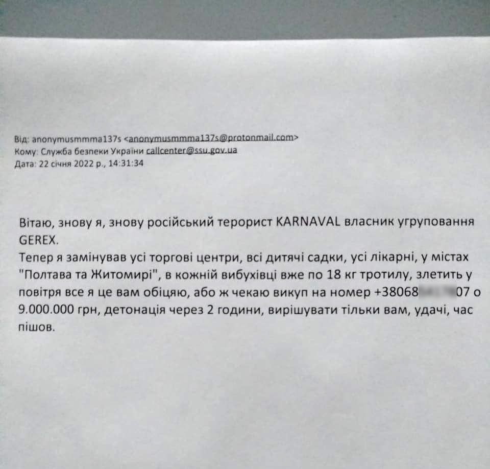 Два дні поспіль на електронну пошту СБУ надходять листи від анонімного терориста, який повідомляє про замінування громадських будівель у Полтаві – ТРЦ, дитячих садків та лікарень, передає видання «Полтавщина».