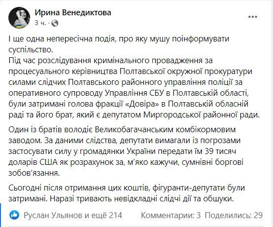 Повідомлення прокурорки Венедіктової з’явилося на її особистій сторінці у фейсбуці. На офіційному сайті Генпрокуратури з’явилося повідомлення про двох депутатів Полтавської обласної ради та Миргородської районної ради, яких викрито на вимаганні, вчиненому за попередньою змовою групою осіб (ч. 2 ст. 189 КК України).