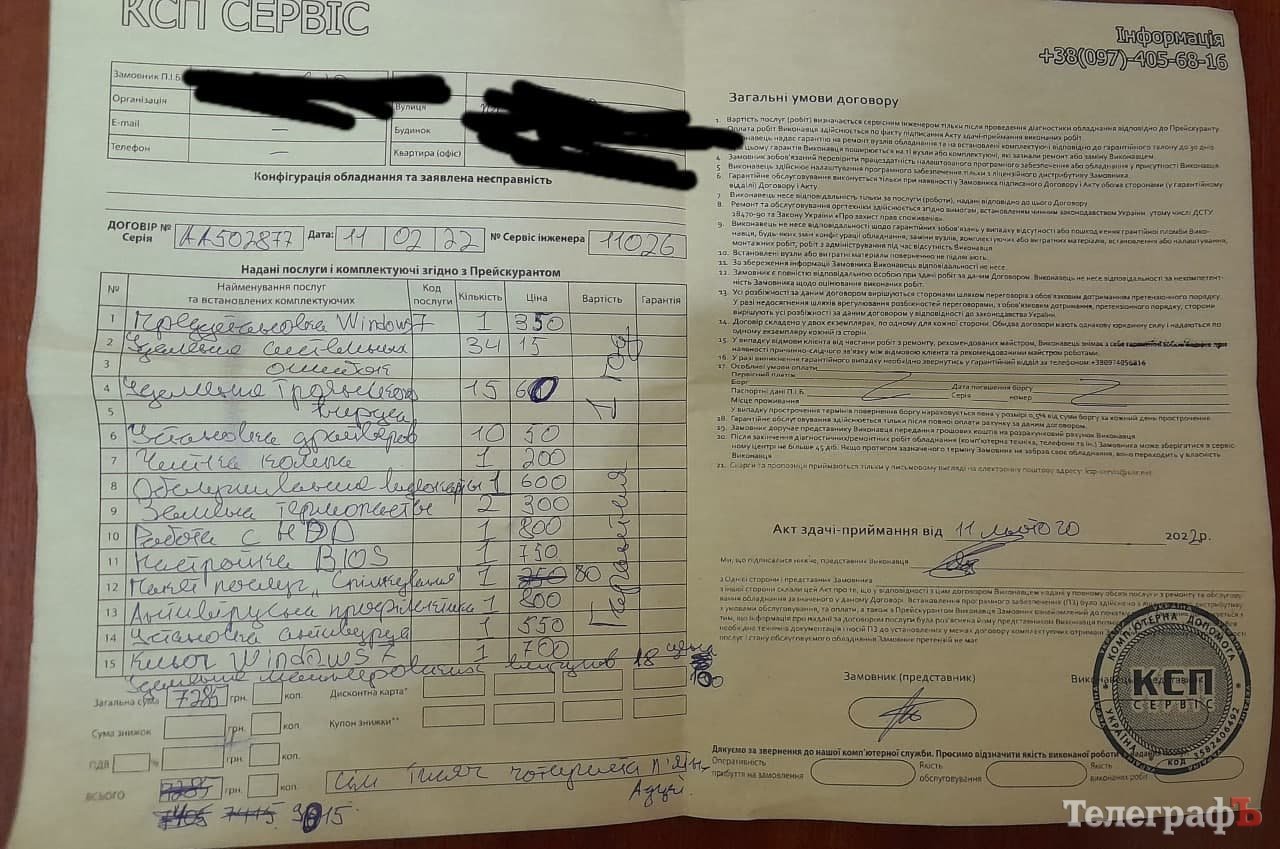 Вона повідомляє, що вирішила викликати комп’ютерного майстра. На сайті ОЛХ знайшла оголошення про ремонт комп’ютерів «не дорого, виїжджають додому». Вони прийняли заявку, по вартості сказали, що обійдеться в 150 грн, за перевстановлення Windows. На заявку прийшли два молоді хлопці, години 2 провозилися з ноутом, ще подивилися стаціонарний комп’ютер, він старенький, розкрутили, почистили від пилу вологими серветками. Під час розмови з ними, кілька разів запитувала про вартість, на що була відповідь – наприкінці порахуємо. У результаті рахунок – 9015.00 грн. Начебто вони встановили антивірус за 550.00 грн, і ще в рахунку вказали видалення троянських вірусів, 15 шт. по 60 грн, видалення майнерських вірусів 18 штук по 100 грн, Чистка процесора на 600 грн тощо. У жінки не було таких коштів, їй довелось брати кредит, бо «працівники» вимагали розрахунок одразу.