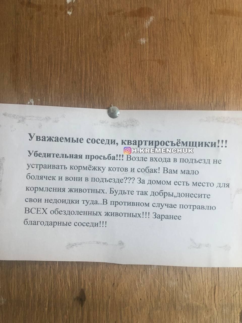 Житель під’їзду погрожує потруїти тварин, яких підкормлюють інші жителі.