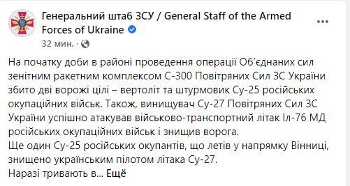 - На початку доби в районі проведення операції Об’єднаних сил зенітним ракетним комплексом С-300 Повітряних Сил ЗС України збито дві ворожі цілі – вертоліт та штурмовик Су-25 російських окупаційних військ. Також, винищувач Су-27 Повітряних Сил ЗС України успішно атакував військово-транспортний літак Іл-76 МД російських окупаційних військ і знищив ворога.