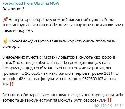– В основному квартири знімали, користуючись послугами ріелторів. У населених пунктах (містах) у ріелторів існують свої робочі чати. Прохання до ріелторів та всіх громадян: якщо у вас є інформація щодо чоловіків, схожих на росіян, які групами по 2-3 особи знімали житло в період з грудня 2021 по теперішній час, телефонувати за номером 0679839403 або на 102, – наголошується у повідомленні.