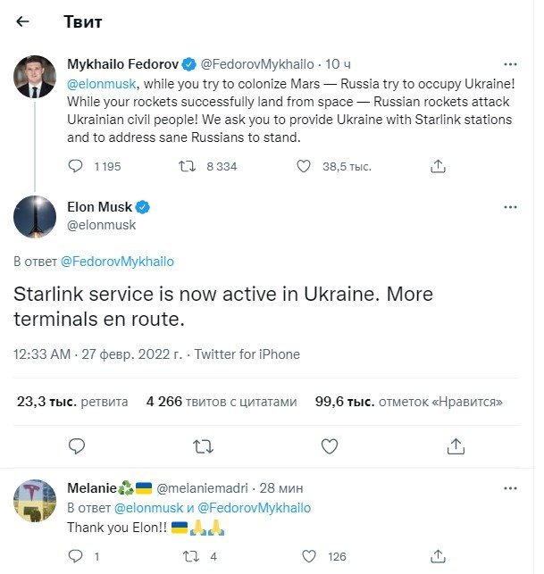 Ілон Маск забезпечить Україну станціями Starlink та доступом до супутникового Інтернету. Про це повідомив сам Ілон Маск у відповіді на твіт віцепрем’єр-міністра – міністра цифрової трансформації Михайла Федорова, який просив бізнесмена і винахідника про це.