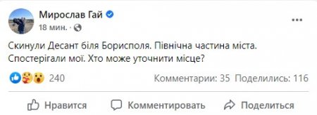 «Скинули Десант біля Борисполя. Північна частина міста. Спостерігали мої. Хто може уточнити місце?», - написав він у фейсбуці.