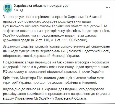 Керівник військової державної адмінстрації Харківської області у своєму телеграм-каналі повідомив, що проти мера Куп'янська порушено кримінальну справу за зраду.