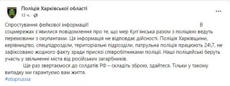 На сторінці у фейсбуку обласної поліції Харківської області є допис, що повідомлення, які розповсюджуються про мера Куп'янська - фейкові.