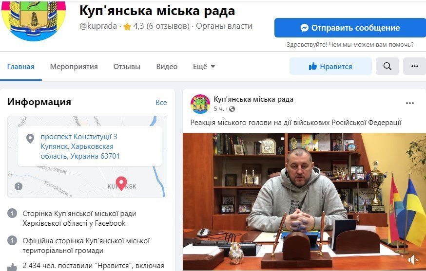 Проте на сторінці міськради Куп’янська у фейсбуку є повідомлення і про перемовини з російськими військовими, і саме відео, ідентичне тому, що потрапило в інші соцмережі. Проте воно з’явилося там набагато пізніше, ніж допис поліції.