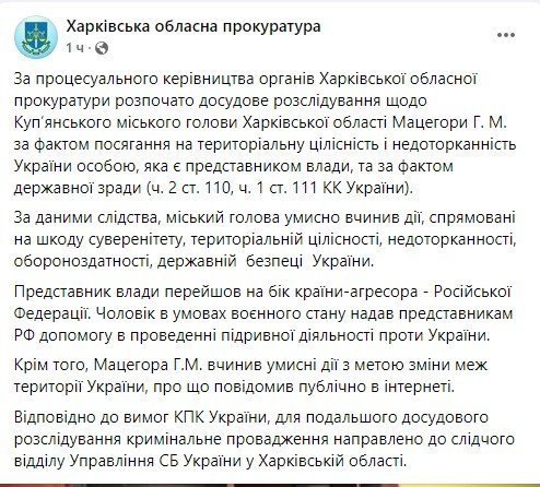 Керівник військової державної адмінстрації Харківської області у своєму телеграм-каналі повідомив, що проти мера Куп’янська порушено кримінальну справу за зраду.