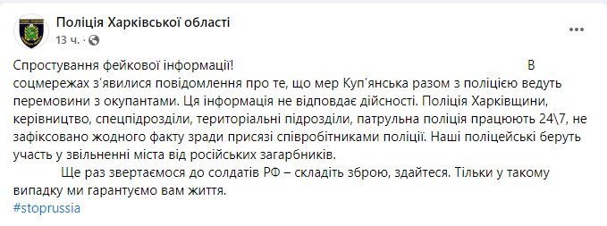 На сторінці у фейсбуку обласної поліції Харківської області є допис, що повідомлення, які розповсюджуються про мера Куп’янська – фейкові.