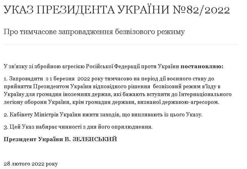 Володимир Зеленський підписав указ №82/2022 про запровадження тимчасового безвізового режиму для іноземців, які їдуть до України боротися з російськими загарбниками.