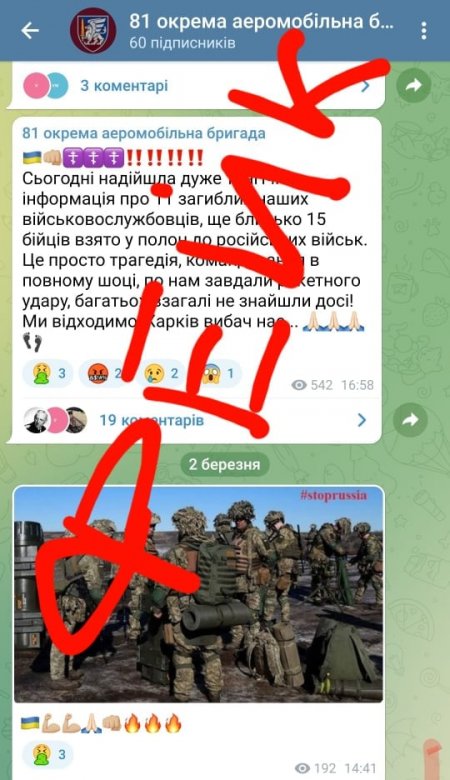Генеральний штаб Збройних сил України повідомляє про черговий фейк. Російські окупанти почали масове створення фейкових сторінок наших військових частин. Наприклад 93-ї омбр, 81-ї і т.і. Сторінки ворог веде українською ("паляниця" ж говорити не треба). Контент, що публікується (втрати наших підрозділів, загиблі цивільні, негатив про українську армію і т.і.) покликаний викликати паніку та невдоволення командуванням (керівництвом).