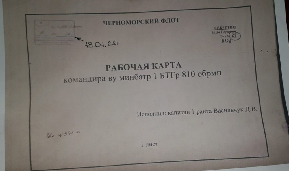 В паніці вони лишають і таємні документи. Так, у нашому розпорядженні опинилися планувальні документи одного з підрозділів батальйонної тактичної групи 810-ї окремої бригади морської піхоти Чорноморського Флоту Російської Федерації. Про це повідомляє пресслужба Операції об'єднаних сил.