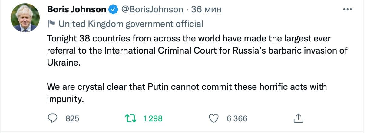 Прем'єр-міністр Великої Британії Борис Джонсон повідомив, що 38 країн подали найбільше звернення до Міжнародного кримінального суду через вторгнення Росії в Україну.