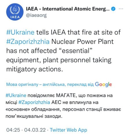 4.40. Водночас Міжнародне агентство з атомної енергії (МАГАТЕ) з посиланням на Україну повідомило у Твіттері, що пожежа на ЗАЕС не вплинула на основне обладнання.