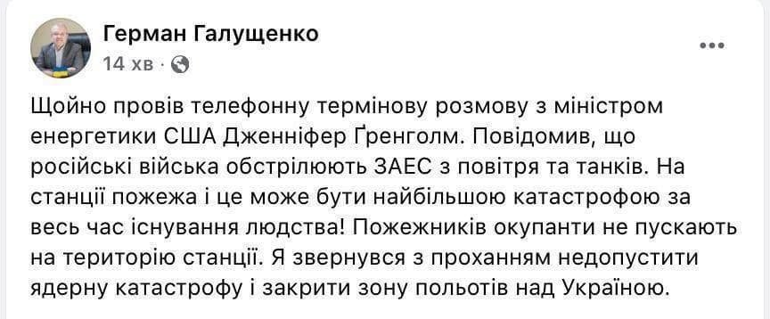 4.33. Міністр енергетики України Герман Галущенко провів розмову з міністром енергетики США. Він звернувся з тим, щоб не допустити ядерну катастрофу і закрити зону польотів над Україною.