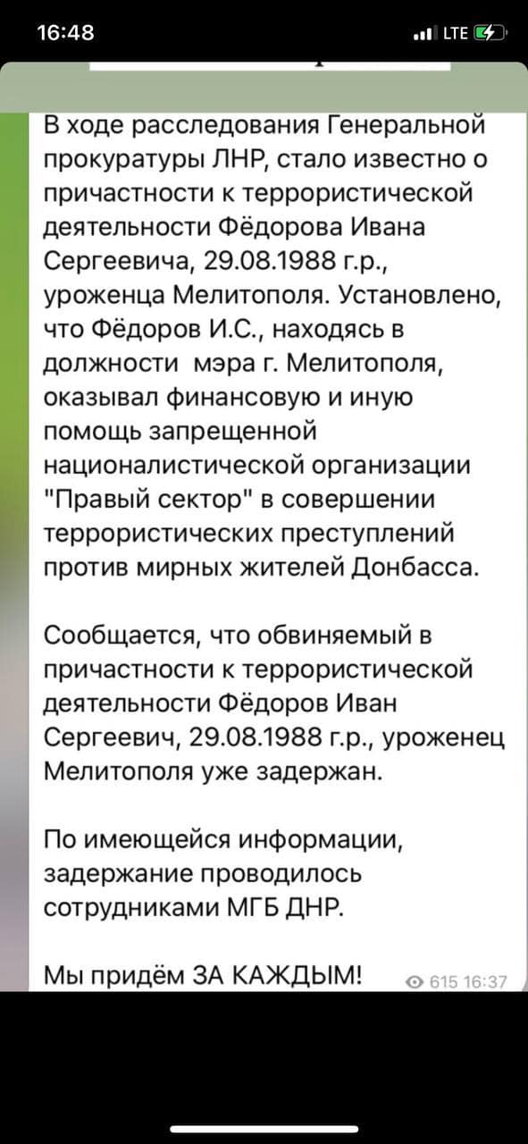 Після викрадення Івана Федорова у російських ЗМІ з’явилася інформація, що мера Мелітополя затримали, бо підозрюють у тероризмі та допомозі теротистичній організації «Правий сектор». Івана Федорова забрали представники російських спецслужб.