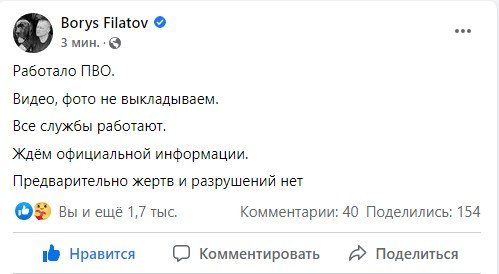За інформацією мера Дніпра Бориса Філатова, спрацювала ПВО, попередньо жертв та руйнувань немає.