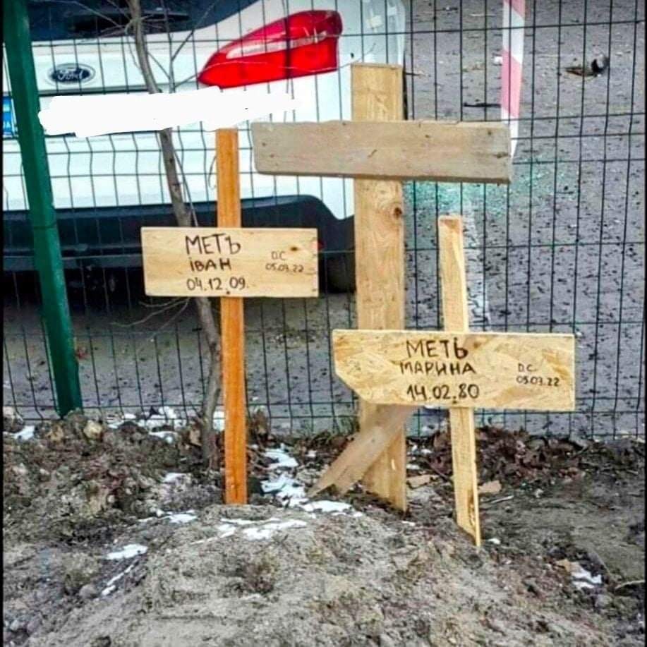 У фейсбук-спільноті «ЄвроМайдан» з’явилося фото, як в Ірпені люди ховають померлих прямо у дворі будинку. Родину Меть рашисти вбили 5 березня 2022 року.