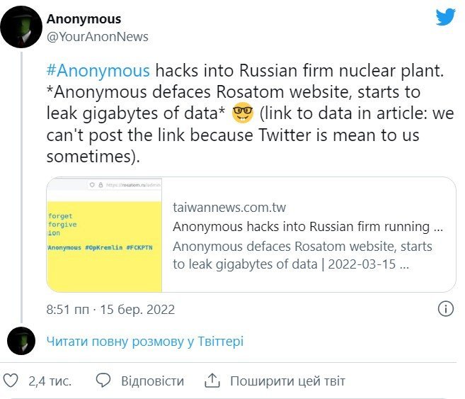– Anonymous зламав сайт Росатому, починає зливати гігабайти даних, – йдеться в повідомленні.