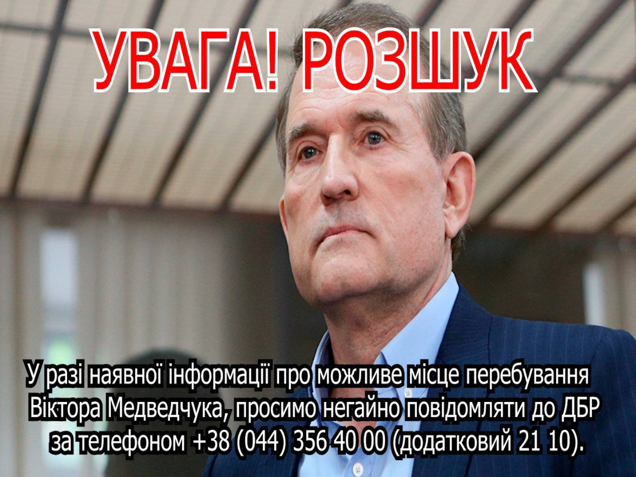 Звертаємося до українців які перебувають на території держави та за її межами, у разі наявної інформації про можливе місце перебування Віктора Медведчука, просимо негайно повідомляти до ДБР на електронну адресу inform.dbr@gmail.com