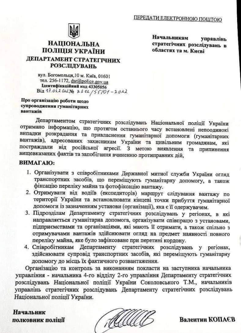 Деякі українці розкрадають гуманітарні вантажі, тому поліція посилює перевірки. Про це йдеться у листі начальника департаменту стратегічних розслідувань Нацполіції Валентина Копаєва до начальників управлінь стратегічних розслідувань.