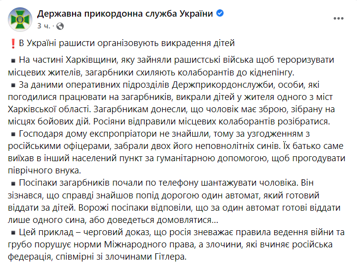 Державна прикордонна служба повідомляє, що на частині Харківщині, яку зайняли рашистські війська, в одного жителя викрали дітей.